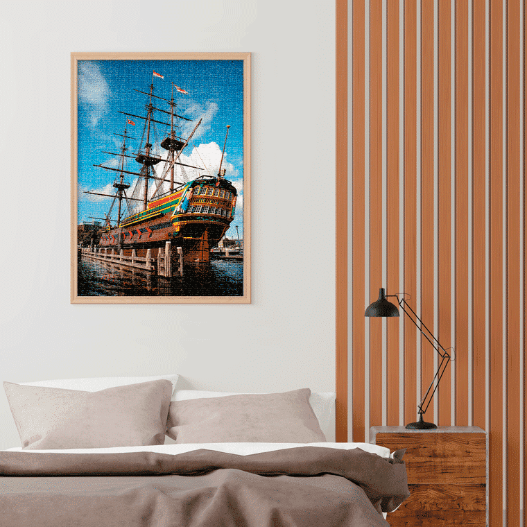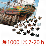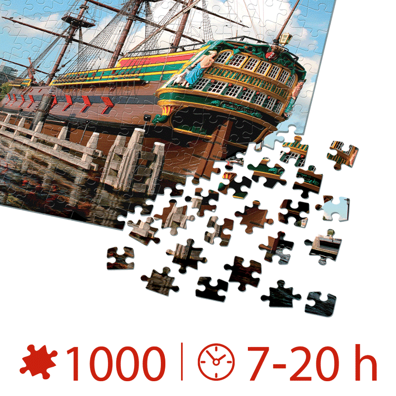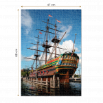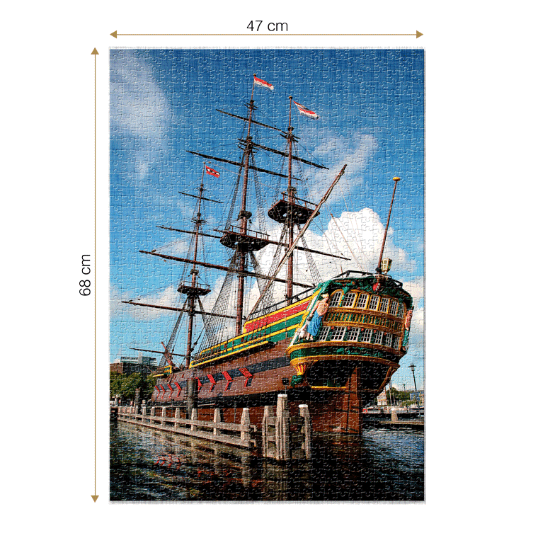 Puzzle 1000 piese Amsterdam reda imaginea unui obiectiv reprezentativ al capitalei olandeze: replica unei nave din secolul al XVIII-lea apartinand companiei Indiile de Est.