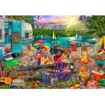 Imaginea vibranta si colorata a puzzle-ului Bluebird cu 2000 piese, intitulat 'The Family Campsite' si creat de Aimee Stewart, surprinde o scena de camping familial idilica.