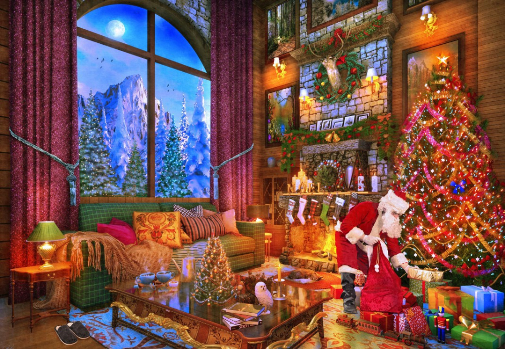 Imaginea puzzle-ului Bluebird cu 1000 de piese, denumit Christmas Lodge, surprinde o scena festiva plina de culoare, in spiritul Craciunului.