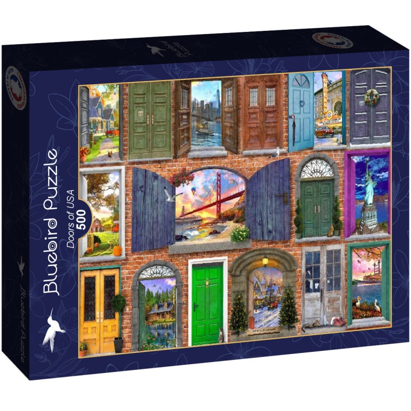 Imaginea prezentata in puzzle-ul Bluebird cu 500 piese ,,Doors of USA" este un colaj captivant care aduce impreuna diverse usi reprezentative din diferite locuri ale Statelor Unite.