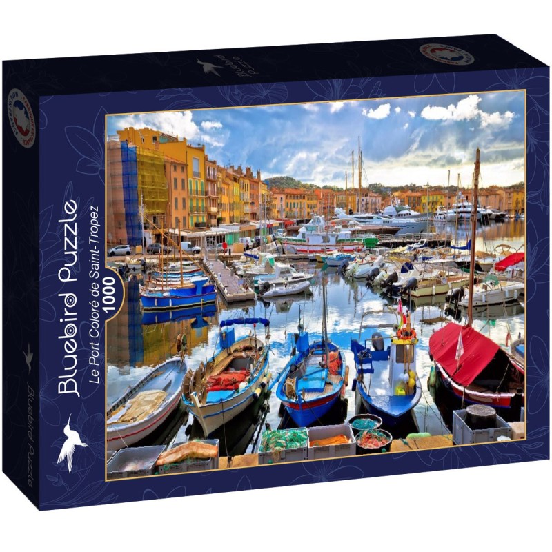 Imaginea acestui puzzle cu 1000 de piese de la Bluebird, intitulat Le Port Colore de Saint-Tropez, surprinde un port vibrant si plin de viata, probabil situat in Saint-Tropez.