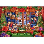 Acest puzzle cu 1000 de piese de la Bluebird, intitulat ,,Ye Old Christmas Shoppe", surprinde o ilustratie digitala ce reda o vitrina festiva dintr-un magazin de Craciun.