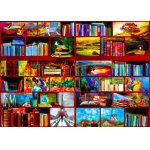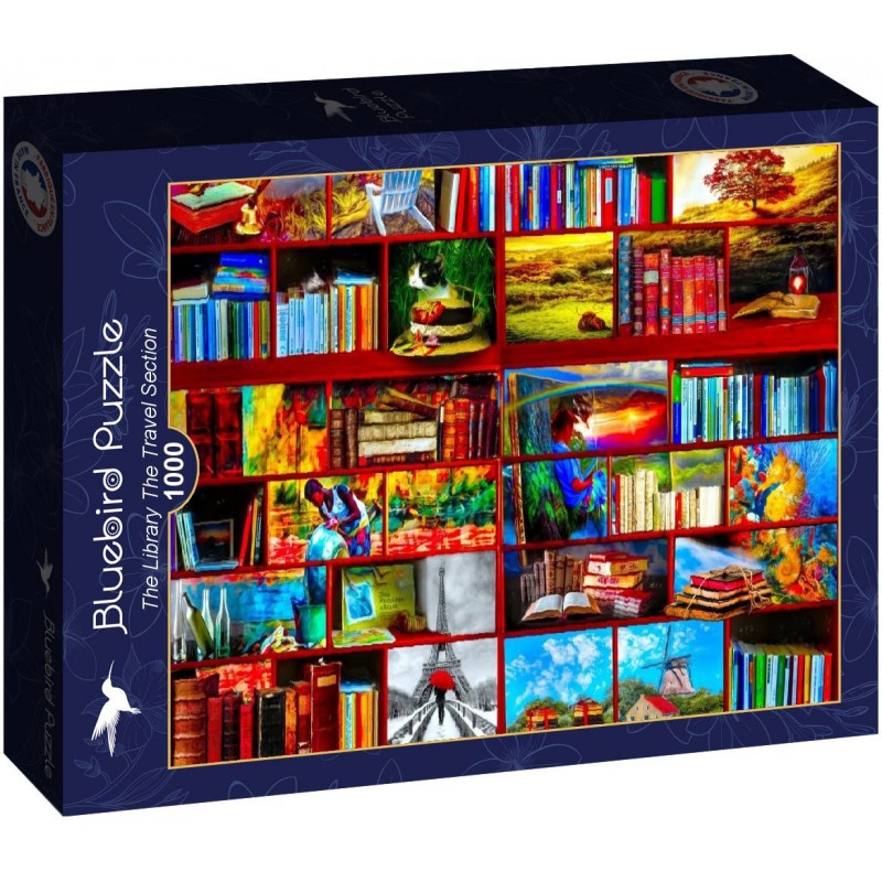 Imaginea puzzle-ului Bluebird cu 1000 de piese, intitulat The Library The Travel Section, reda o serie de scene variate, fiecare amplasata intr-un compartiment al unei biblioteci vaste.