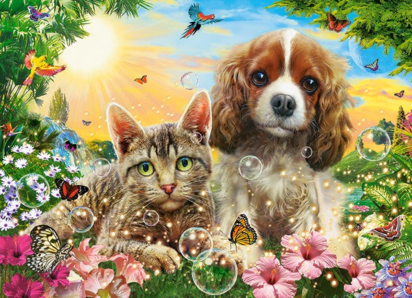 Ilustratia colorata a acestui puzzle captureaza un moment plin de viata si efervescenta, prezentand un caine spaniel cavalier Charles si o pisica tigrata intr-o scena vibranta de natura.