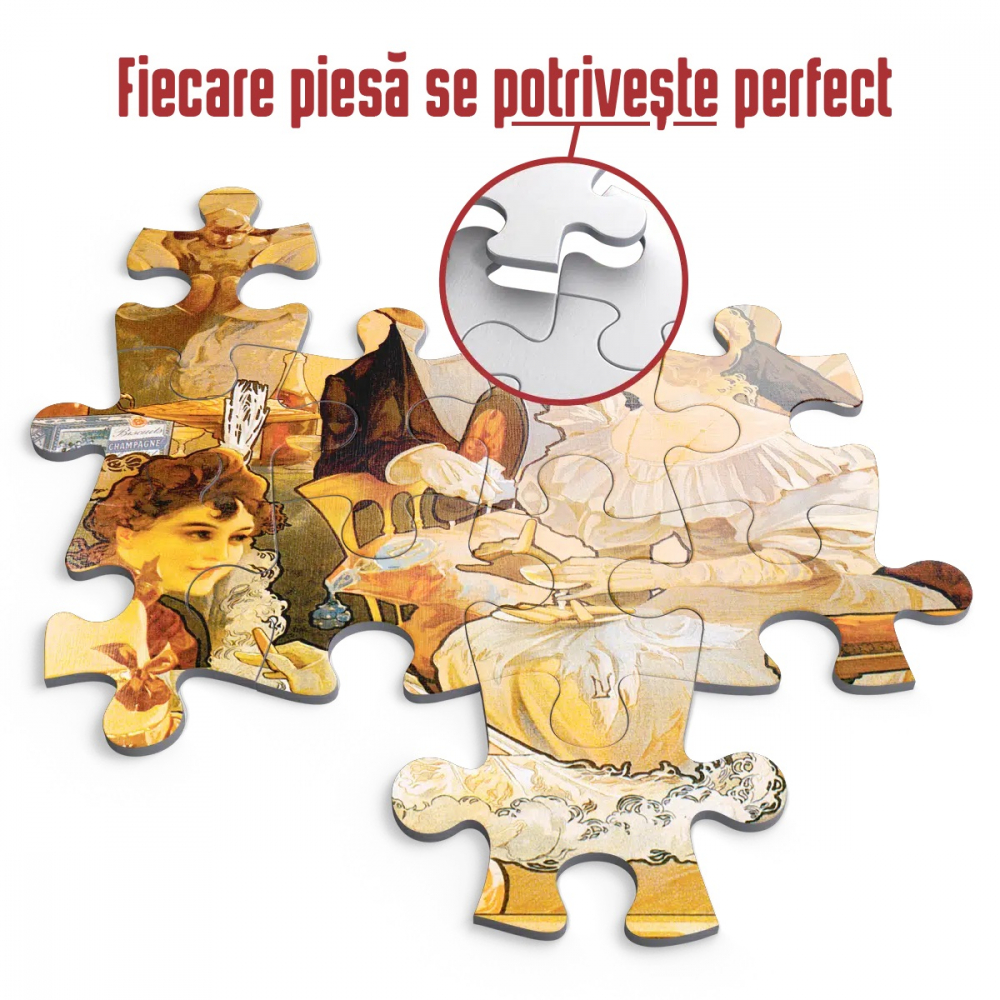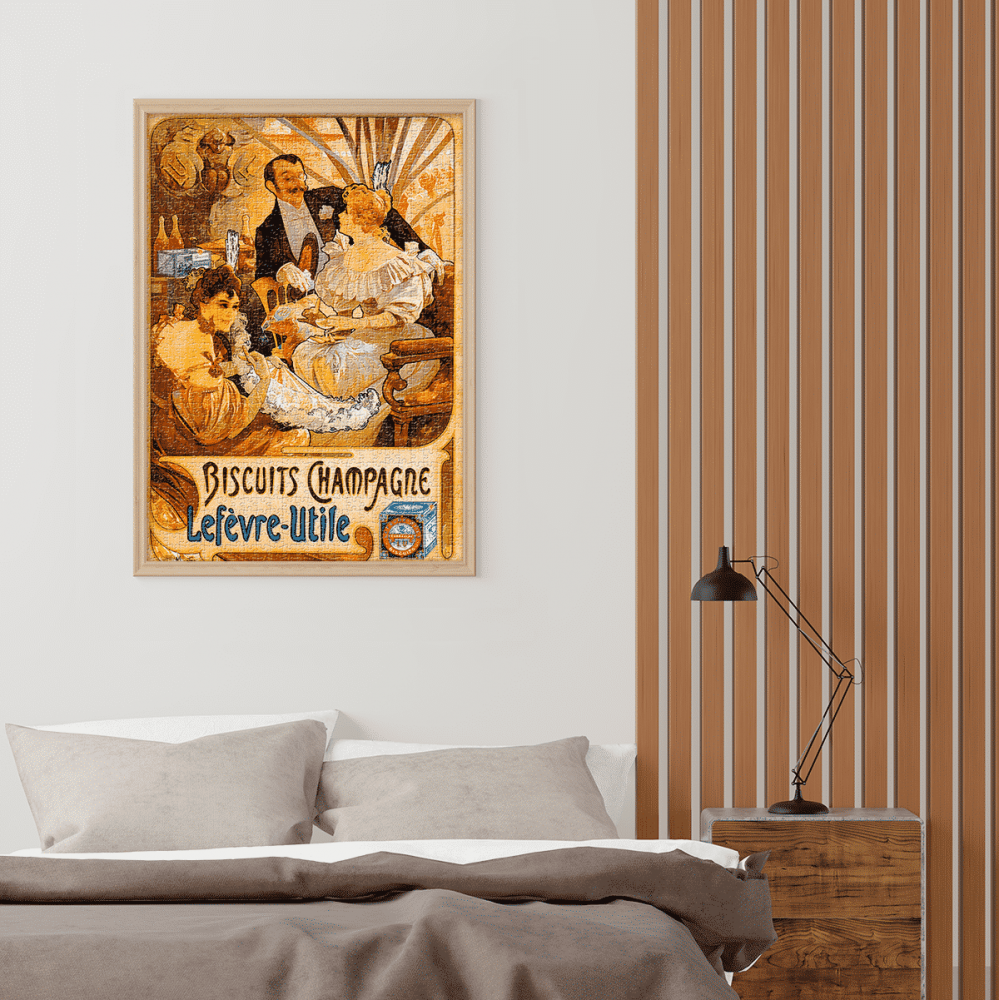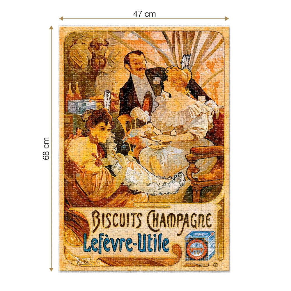 Imaginea din puzzle 1000 piese Biscuits Champagne Lefèvre-Utile aminteste de perioada Art Nouveau, cu eleganta si stilul specific in care Mucha a excelat de-a lungul vietii.
