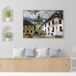 Obtii un tablou cu dimensiunile de 68 x 47 cm al al unei stradute pietruite din Sighisoara, pe fundal avand Turnul cu Ceas .