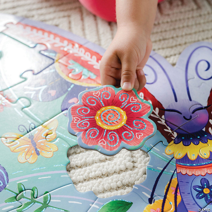 Un puzzle adorabil de podea, in forma de fluture, in culori stralucitoare. Piesele de puzzle sunt groase si rezistente, include piese cu forma unica, o floare, o inima, un fluture etc.