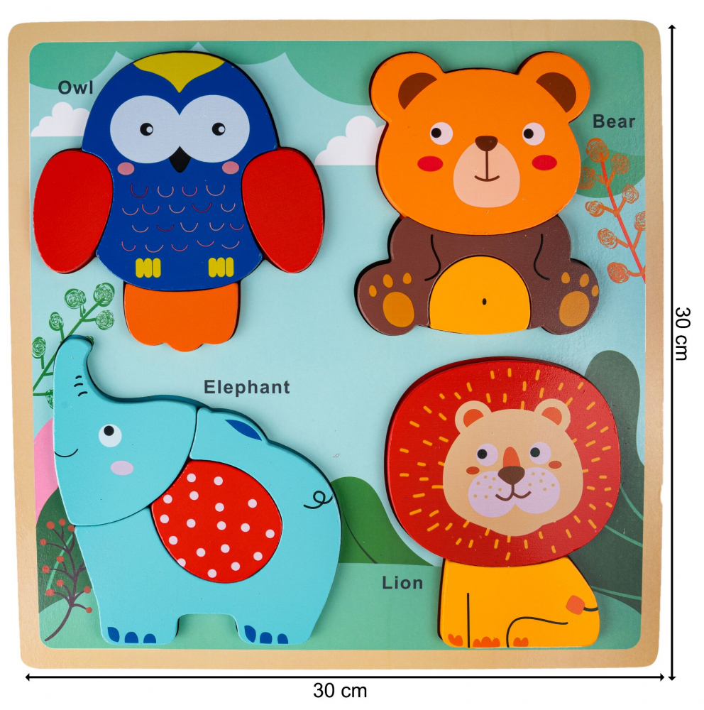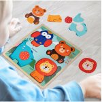 Piese mari si usor de manevrat, cum ar fi bufnita simpatica, ursul jucaus, elefantul bland si leul curajos, il ajuta pe copil sa-si dezvolte motricitatea fina si sa descopere formele si culorile.