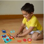 Fiecare piesa, dintr-un lemn robust si finisat cu grija, are forma unui animal adorabil din gradina zoologica, invitandu-l pe copilul tau sa le potriveasca in spatiile lor dedicate de pe placa.