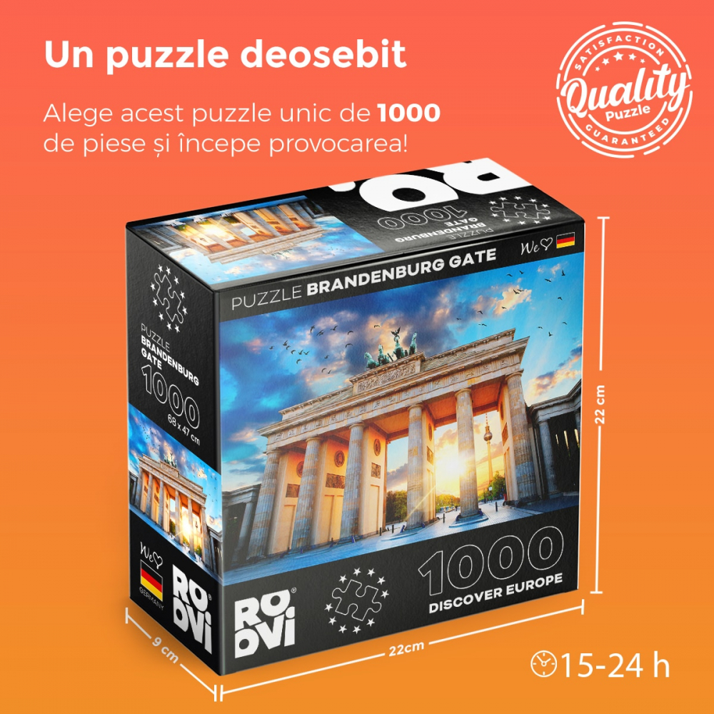 Alege așadar Puzzle 1000 – Brandenburg Gate pentru relaxare, detașare de la cotidian sau pentru a practica recunoștința pentru momentul prezent. Antrenează-ți atenția, memoria și concentrarea cu acest puzzle deosebit din colecția Puzzle 1000 Discover Europe de la ROOVI.