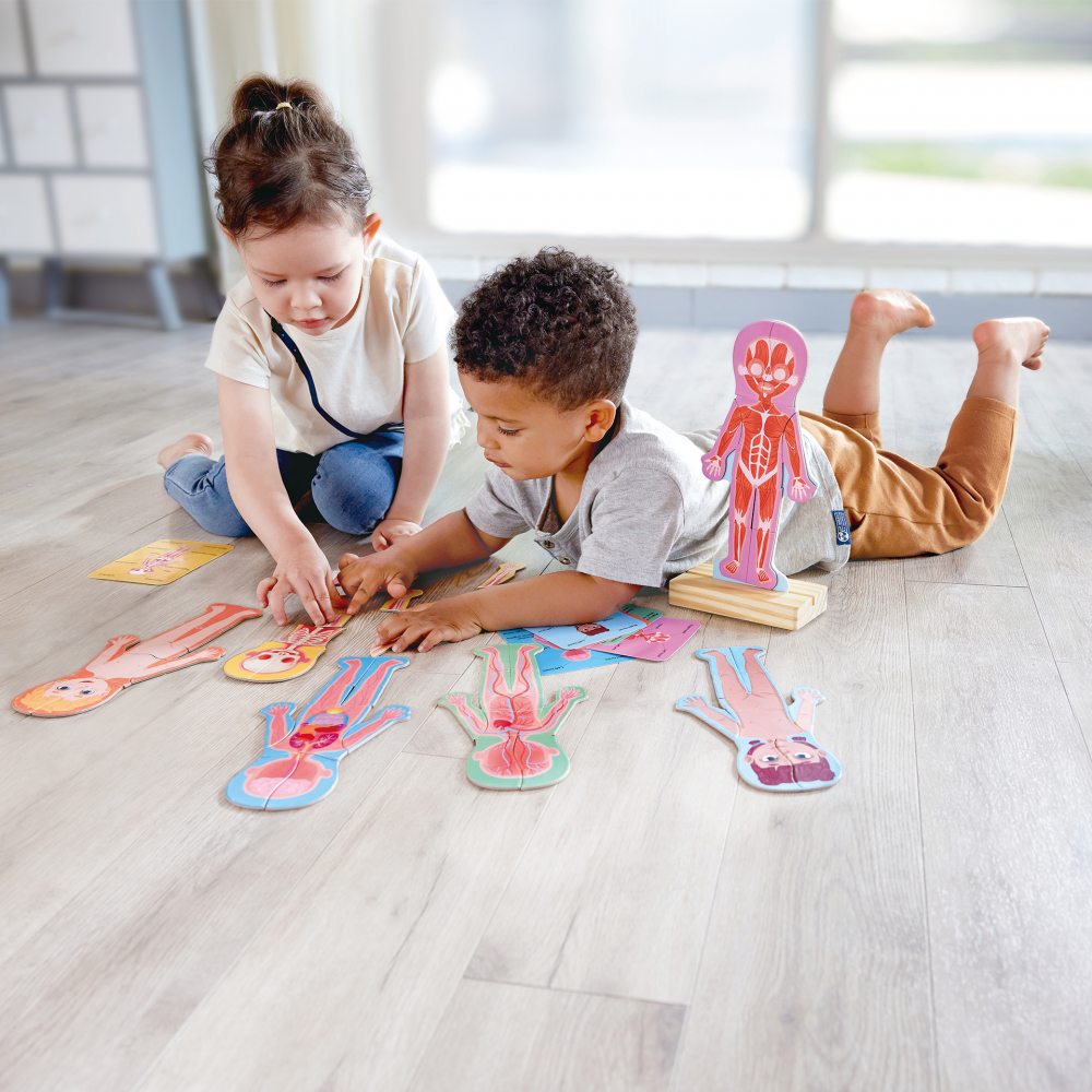Copiii pot invata sa recunoasca diferitele straturi si parti ale corpului pe masura ce potrivesc partile corecte ale corpului pe corpul magnetic folosind cele sase puzzle-uri.