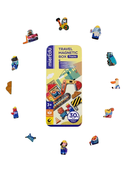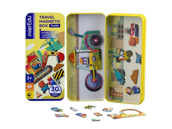 Puzzle magnetic in cutie metalica, joc de potrivire si asociere - Camioane este perfect pentru micii pasionați de vehicule și aventuri.