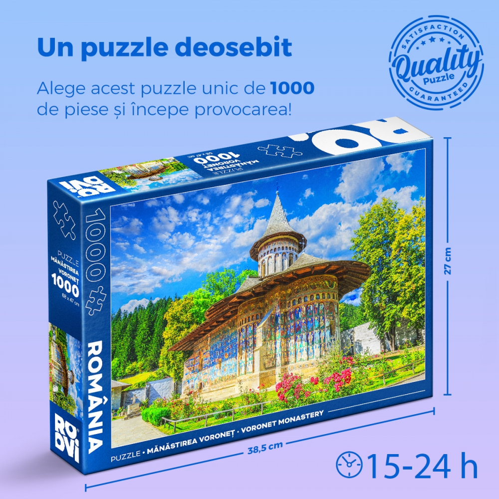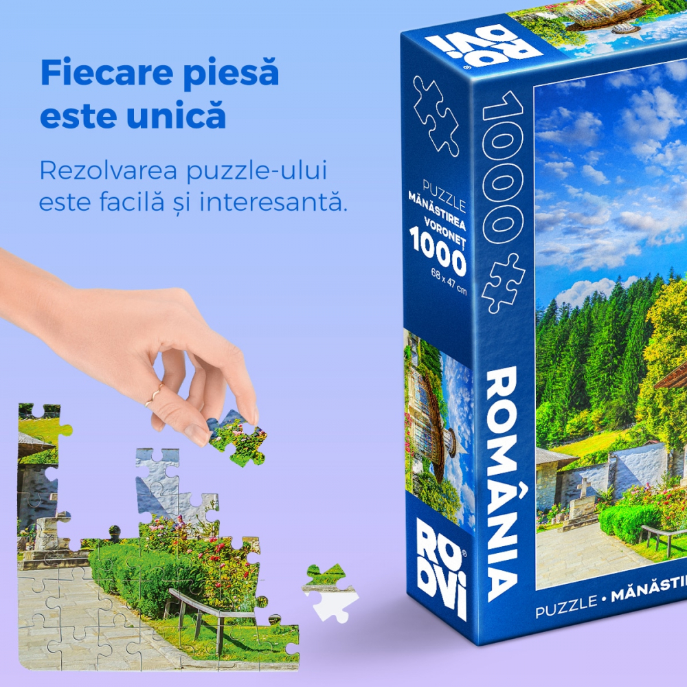 Daca iti doresti o experienta de asamblare fascinanta, daca iubesti arta, istoria si jocul deopotriva, Puzzle 1000 de piese - Manastirea Voronet va fi cu siguranta o surpriza placuta.