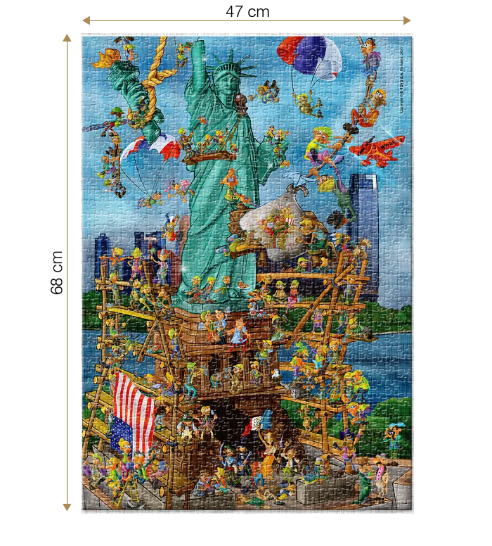 Puzzle 1000 piese Cartoon - New York iti ofera o perspectiva amuzanta in care o multime de personaje adorabile se straduiesc sa ridice unul dintre cele mai cunoscute simboluri americane.