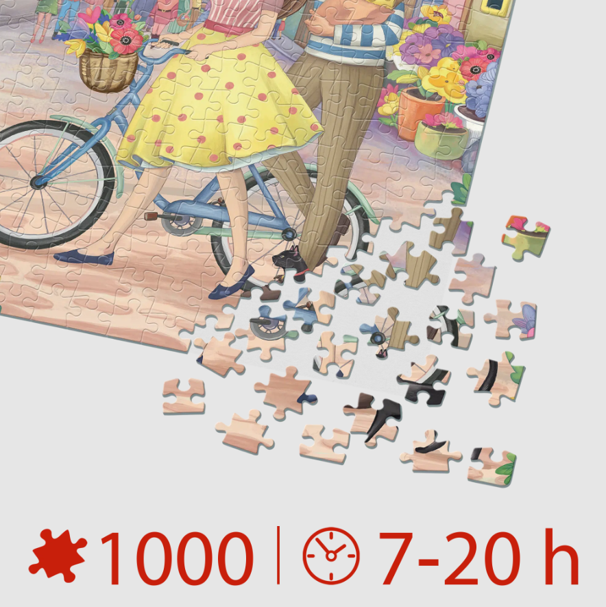 Un cuplu romantic ce tocmai ș-a făcut cumpărăturile pentru picnic de la un magazin cochet din Paris, cu oameni fericiți și Turnul Eiffel pe fundal și baloane de aer colorate zburând pe cerul senin al Parisului este imaginea animată pe care ți-o propune artista Groos Zselyke care a realizat design-ul pentru acest minunat puzzle de artă.