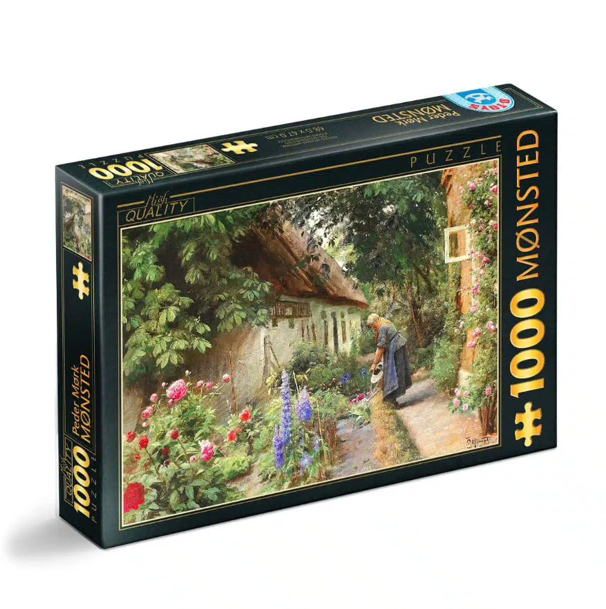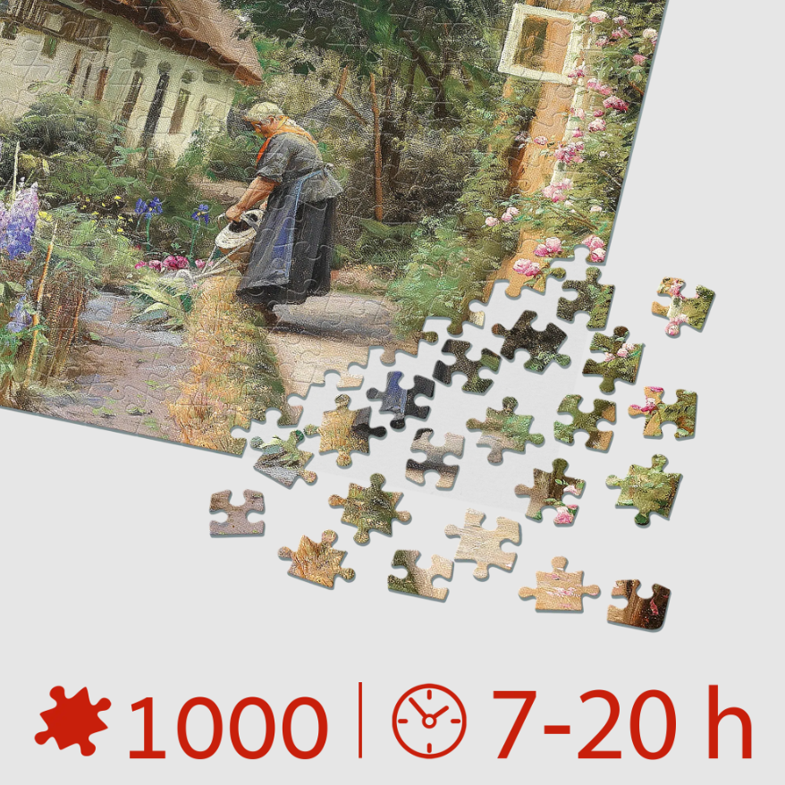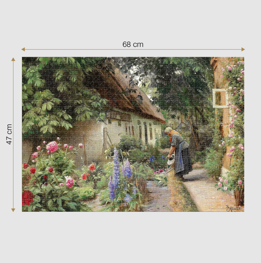 Puzzle 1000 piese Peder Mørk Mønsted – An Old Woman Watering the Flowers Behind the Thatched Farmhouse redă imaginea tabloului omonim al renumitului pictor danez.