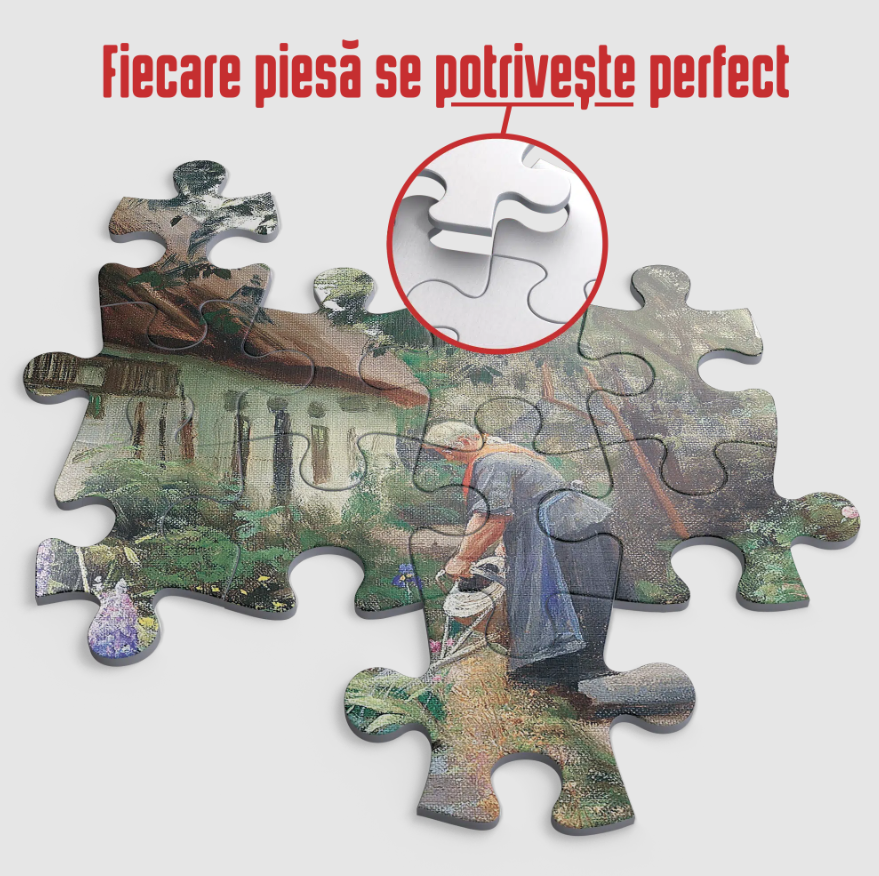 Puzzle-ul de artă Peder Mørk Mønsted – An Old Woman Watering the Flowers Behind the Thatched Farmhouse poate fi al tău cu doar câteva click-uri!