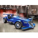 Vehiculul impresioneaza prin liniile sale aerodinamice si o caroserie in nuante vii de albastru.