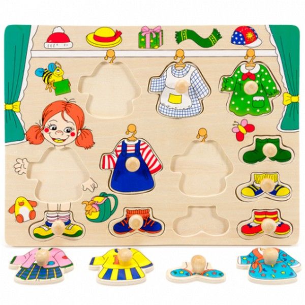 - Puzzle cu piese din lemn cu buton, cu care se pot manevra, avand ca scop crearea unor tinute pentru fetita desenata. Contine 6 costumatii diferite.