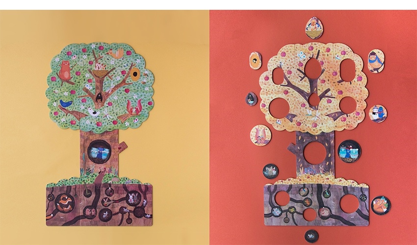 Un puzzle reversibil și interconectat, cu 20 de piese, unele având forme geometrice și altele care se îmbină clasic, pentru cei mai tineri membri ai familiei.