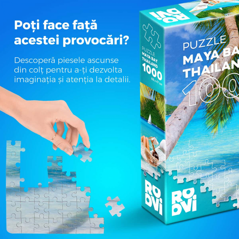 Puzzle 1000 – Maya Bay Thailand este ambalat într-o cutie de calitate superioară, cu un design modern și elegant și poate fi un cadou rafinat, apreciat de orice pasionat de jocuri puzzle.