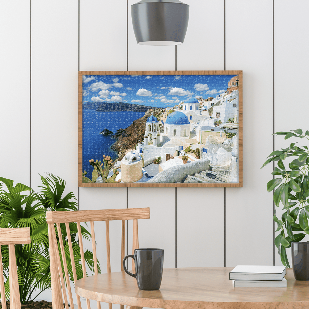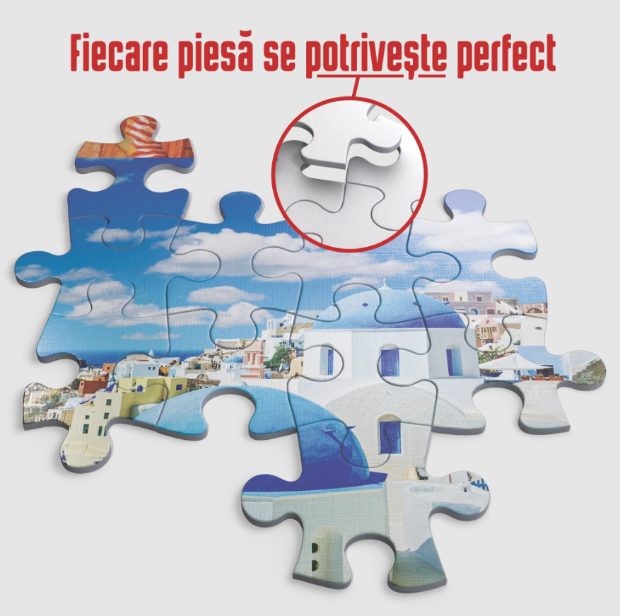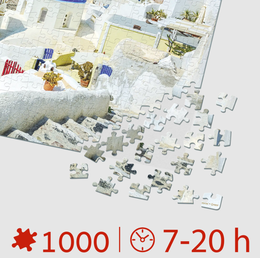 Alege puzzle 1000 piese Santorini pentru o experiență meditativă desăvârșită sau pentru a petrece multe ore de distracție și relaxare alături de cei dragi.