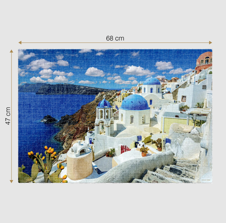 Cu puzzle 1000 piese Santorini poți reface un tablou de poveste al acestei insule emblematice și te poți bucura de o imagine însorită ce te poartă cu gândul la o binemeritată vacanță pe un tărâm plin de legende și simboluri.