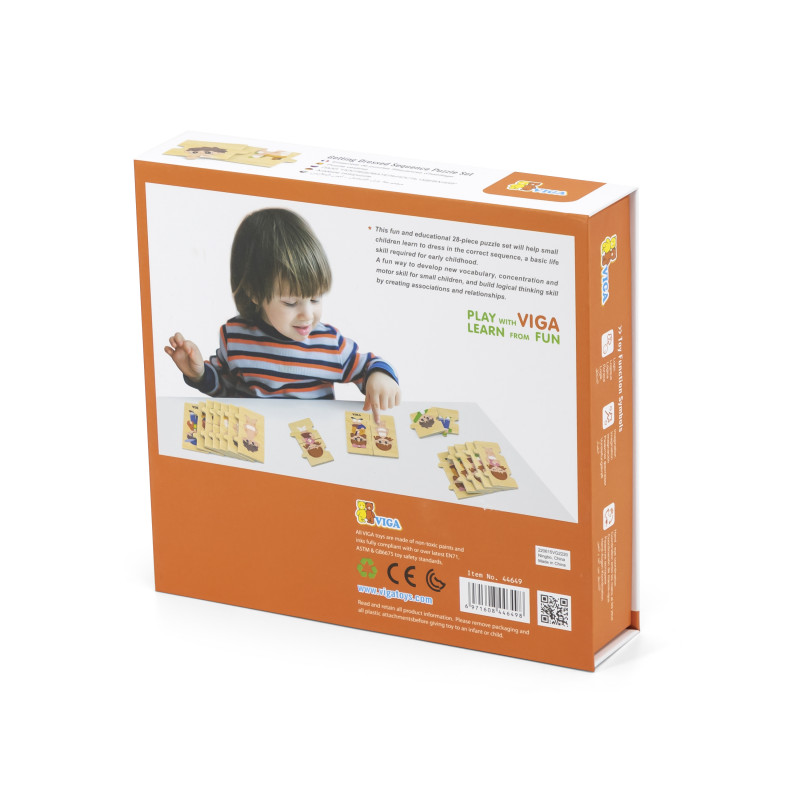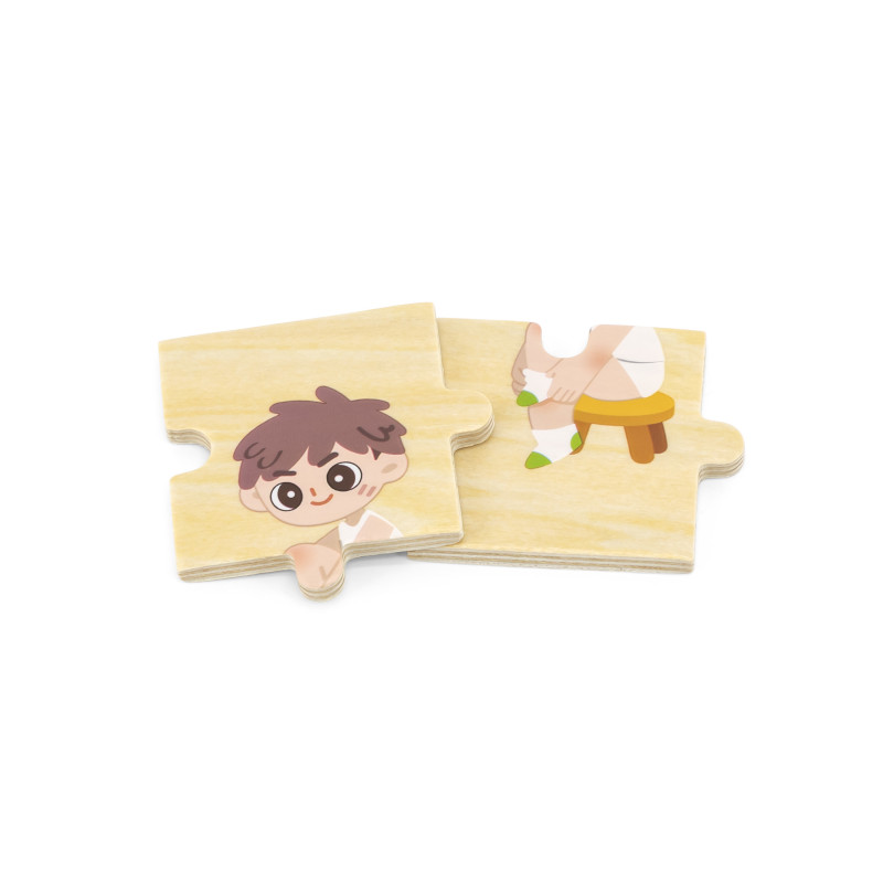 Acest set de puzzle distractiv si educativ cu 28 de piese ii va ajuta pe copii sa invete sa se imbrace in ordinea corecta, o abilitate de viata de baza, necesara pentru prima copilarie.