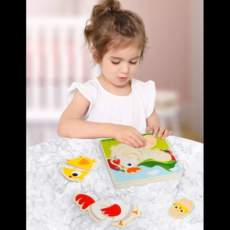 * Pe fiecare strat, copiii vor asambla puzzle-uri colorate si detaliate, urmarind cu uimire cum un simplu ou se transforma intr-un pui pufos.
