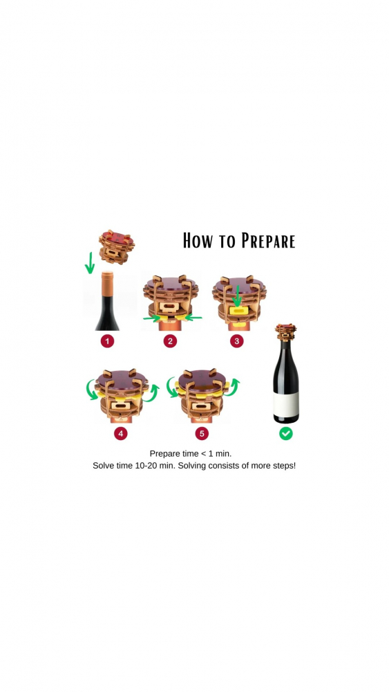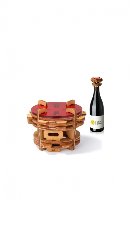 Acest puzzle ingenios se atașează de gâtul unei sticle de vin și trebuie rezolvat înainte ca destinatarul să poată savura conținutul.