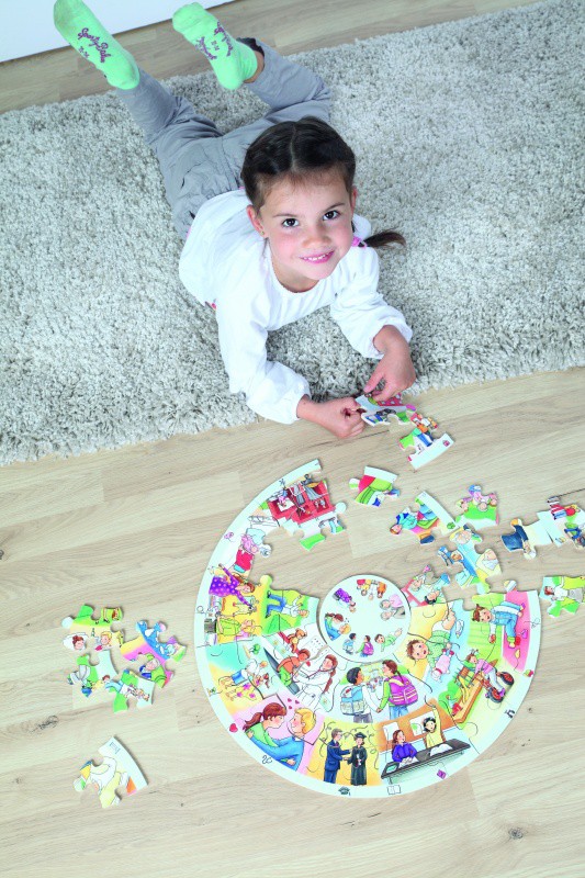 Puzzle-ul XXL reflecta activitatile obisnuite pe care copiii le efectueaza in fiecare zi si ii ajuta sa inteleaga conceptul de timp.