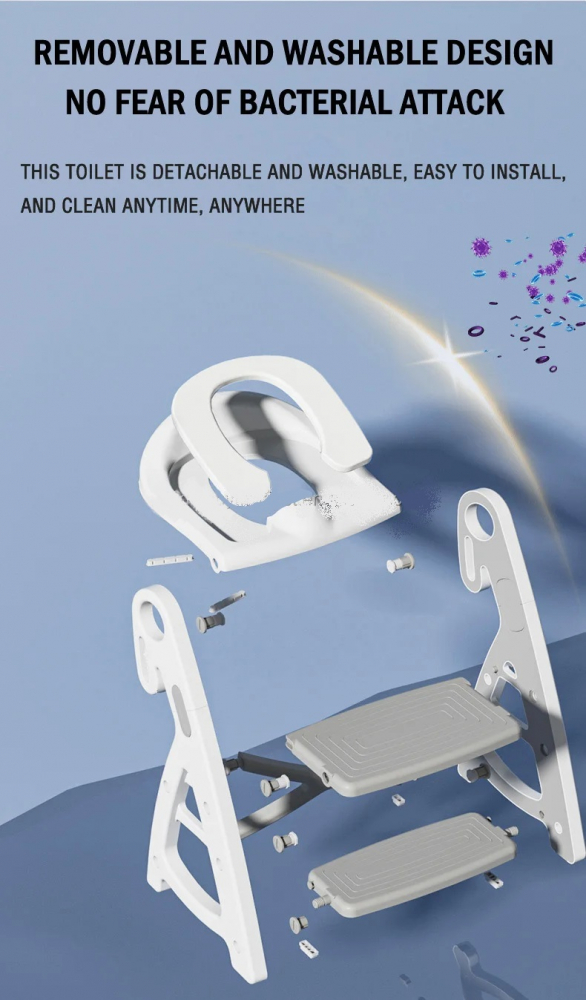- Picioarele anti-derapante ale reductorului sunt reglabile in inaltime, pentru a se adapta diferitelor tipuri de toalete. Odata asezat, pentru mai mult confort isi poate aseza piciorusele pe treapta.