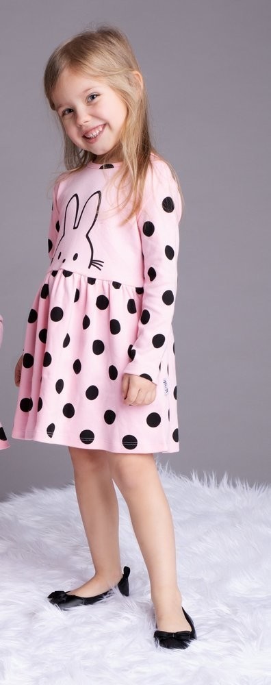 Rochita larga cu maneci lungi, usor evazata la baza, realizata din bumbac roz cu buline negre si decorata cu imprimeu cu iepuras.