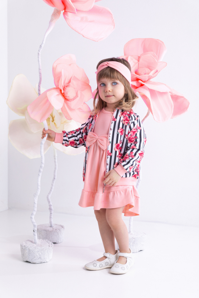Rochita eleganta cu maneca scurta realizata din bumbac roz, decorata cu o funda mare pe piept.
