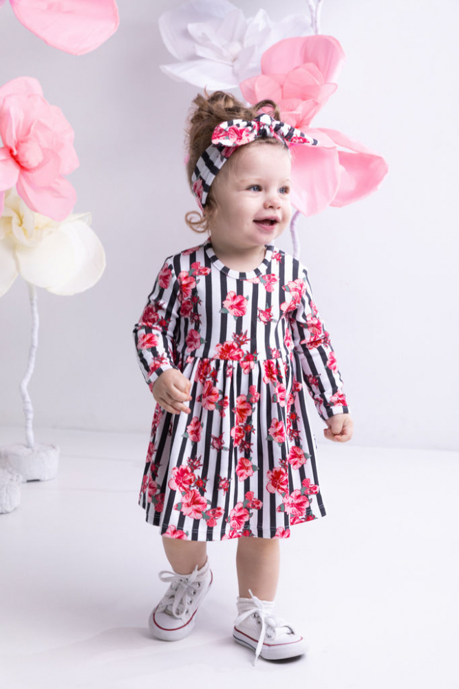 Rochita de bumbac cu maneca lunga dungi si flori Nicol NANA Roz marimea 110