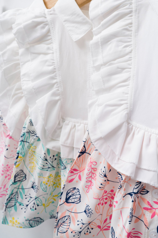 - Rochita este fara maneci, volane decorative verticale.