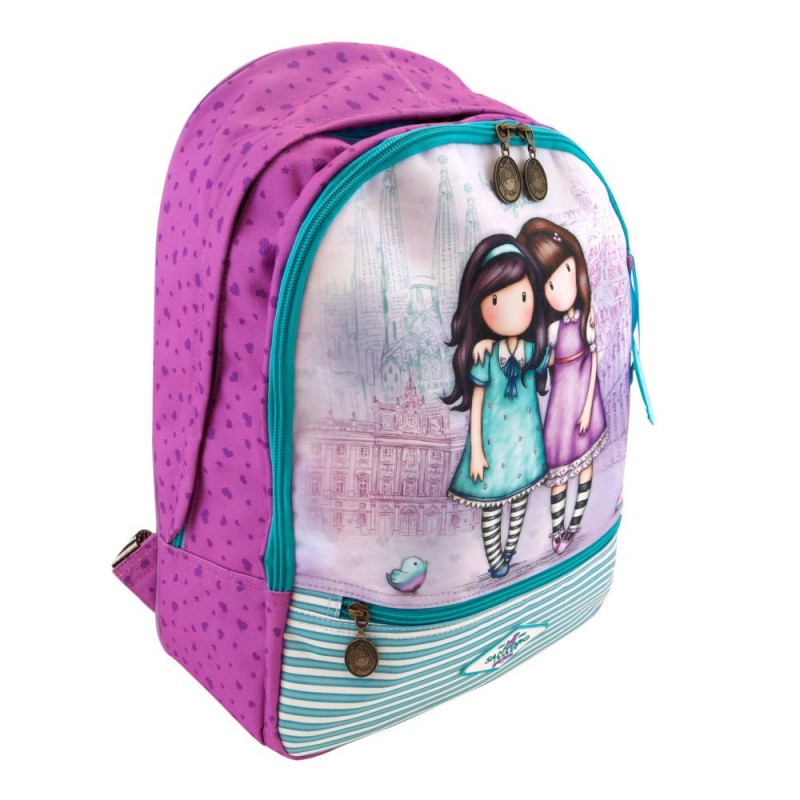 Gorjuss Cityscape Rucsac - Friends Walk Together de la Santoro este un rucsac deosebit accesorizat, foarte atractiv. Rucsacul de la Santoro este prevazut cu un singur compartiment spatios mare si un buzunar in partea din fata, toate se inchid cu fermoar ce are atasat cheite cu chipul fetitei Gorjuss. Pe spate este prevazut cu doua bretele ajustabile care permit purtarea pe umeri.
