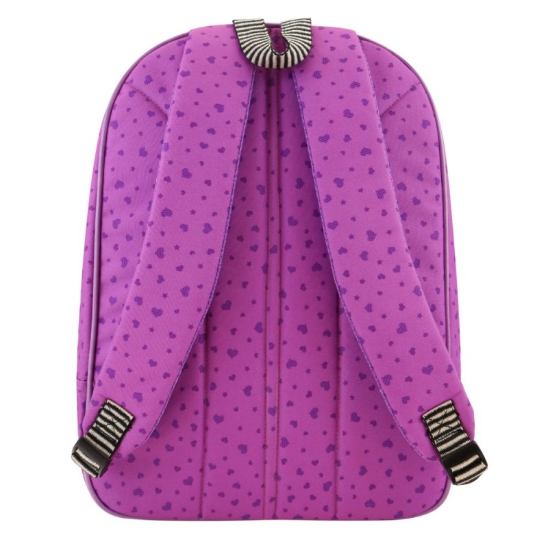 In partea de sus a rucsacului se gaseste un maner din material textil, in dungi monocrome,agatat de manerul rucsacului se afla o mica supriza ce consta intr-un pasaport dragut si sticker cu indragita fetita Gorjuss.