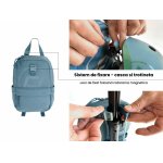 Pe partea laterala a rucsacului exista doua buzunare laterale mai mici pentru sticle (unul dintre ele are un carlig pentru cheie suplimentar si un suport pentru carti de vizita), iar pe partea din fata - un buzunar cu fermoar, perfect pentru depozitarea unui portofel sau batiste pentru copii. In partea de jos a rucsacului exista o clema suplimentara la ghidonul scuterului.