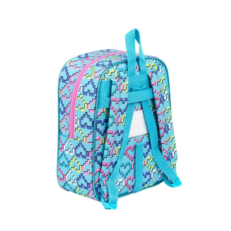 Intr-o vesela nuanta de turcoaz imprimat cu inimi multicolore, interiorul este rezistent la apa. Pe spate are sistem reglabil de prindere pentru troler si eticheta pentru identificare unde se pot scrie numele, adresa si numarul de telefon.