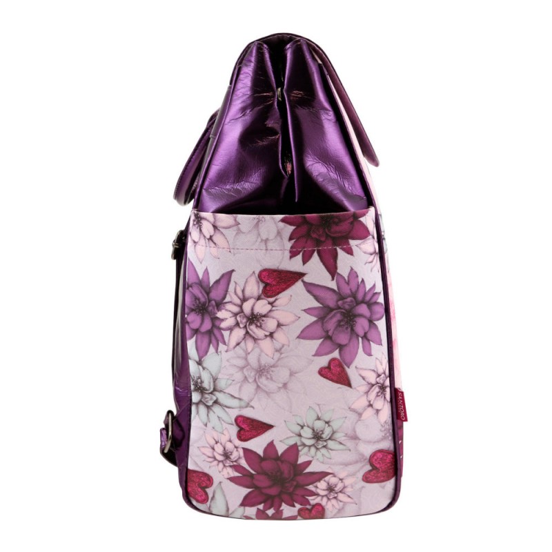 Elementele de arta elegante Secrets de la Santoro se gasesc pe partea din fata a acestui rucsac elegant într-o paleta de culori blande de lila, roz și mov, in timp ce inchiderea clapetei, cureaua reglabila și spatele sunt impodobite cu element metalic purpuriu stralucitor.
