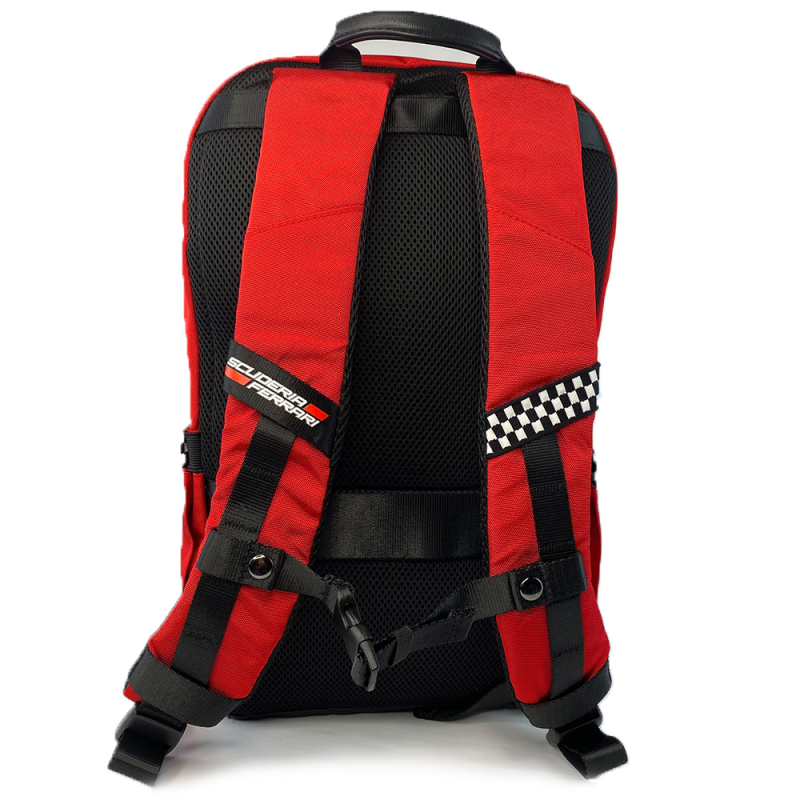- Spatele rucsacului Ferrari rosu este captusit si are o curea care permite atasarea lui la orice tip de troler de voiaj.