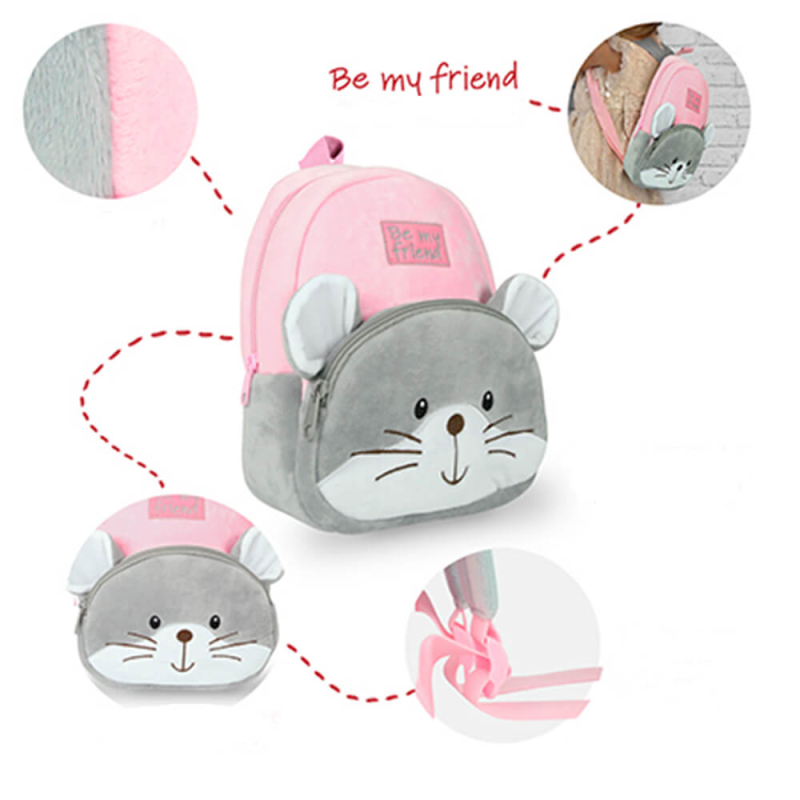 Rucsacel din plus, cu un buzunar frontal adorabil de soricel cu urechi, ideal atat la gradinita, cat si pentru uzul zilnic, sau pentru iesirile in familie. facandu-l un companion fantastic pentru copilul tau care va dori mereu sa-l poarte cu el.