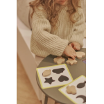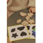 • Conținutul setului – 8 figurine din lemn, 8 carduri duble față cu contururi și imagini colorate, 2 carduri duble față pentru jocul de loto și un săculeț din pânză cu șnururi pentru depozitare.