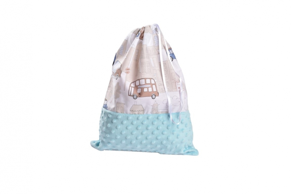 Saculet pentru cresa si gradinita model Masinute din bumbac si minky bleu