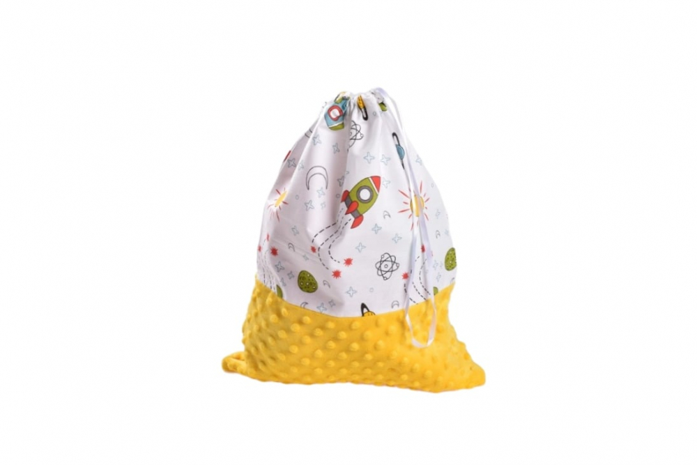 Saculet pentru cresa si gradinita model Rachete din bumbac si minky galben