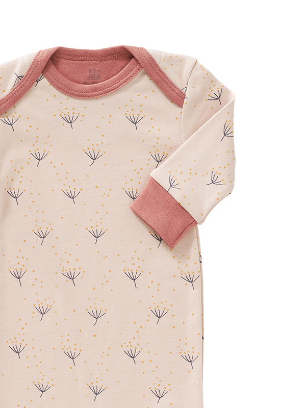 Salopetă-pijama, pentru bebeluși, realizată din bumbac organic 100%, cu certificare GOTS, cu un model delicat cu păpădii și o frumoasă culoare roz prăfuit. Se deschide cu capse în dreptul scutecului și se poate scoate cu totul prin partea de jos datorită pliurilor de la umeri. Este perfect pentru somn și joacă, în zilele mai răcoroase.