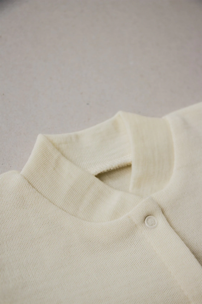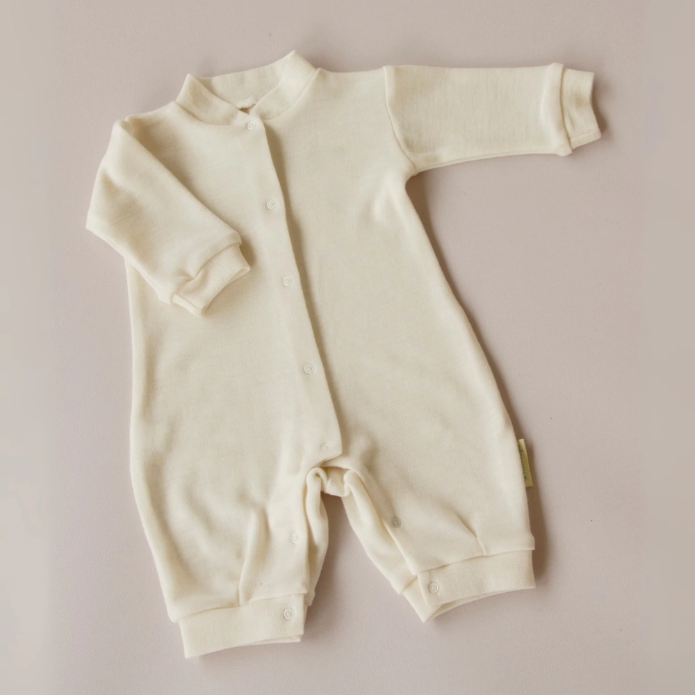 Ideală pentru somn, plimbări și momentele de joacă, această salopetă îmbrățișează pielea delicată a bebelușului cu finețea și protecția firească a lânii merinos.