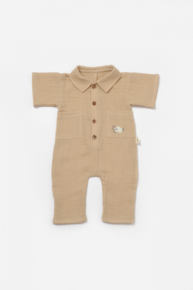 Salopeta cu maneca scurta si nasturei Sheep 100% bumbac Apricot BabyCosy 3-6 Luni