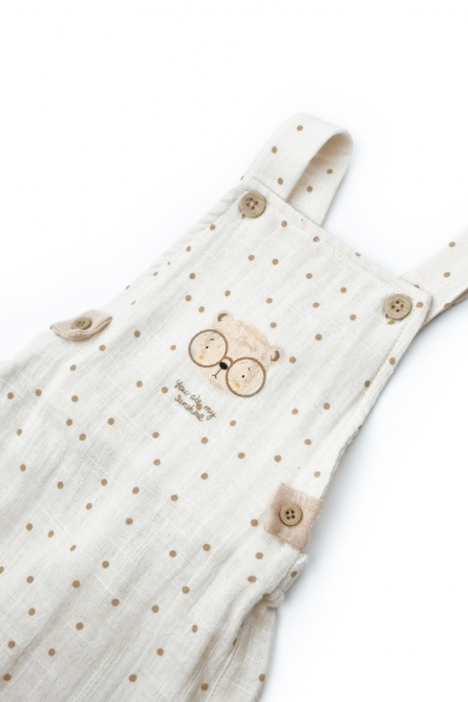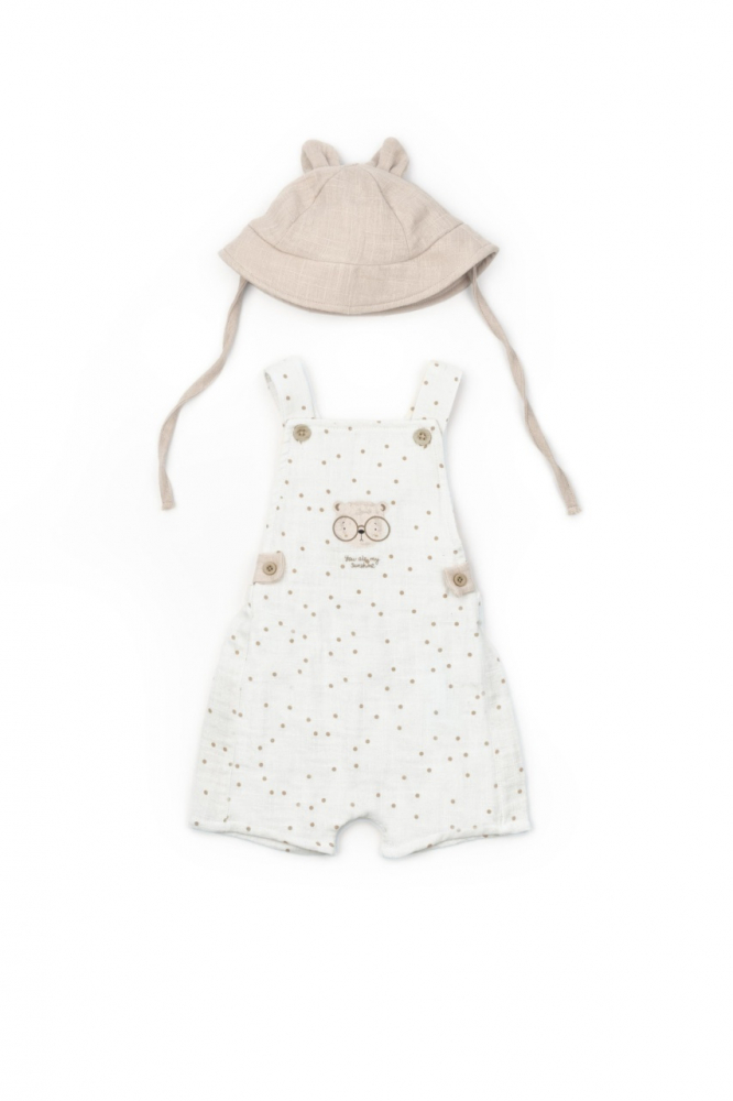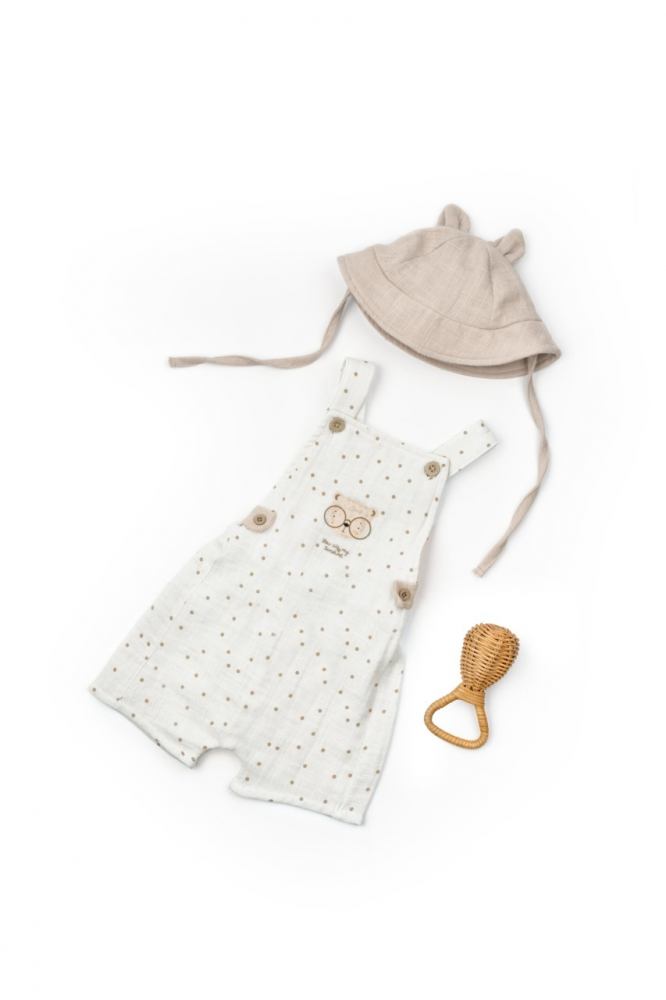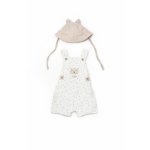 Salopeta de vara cu palariuta, pentru bebelusi, BabyCosy TeddyBear, 100% bumbac organic, marime 9-12 luni
